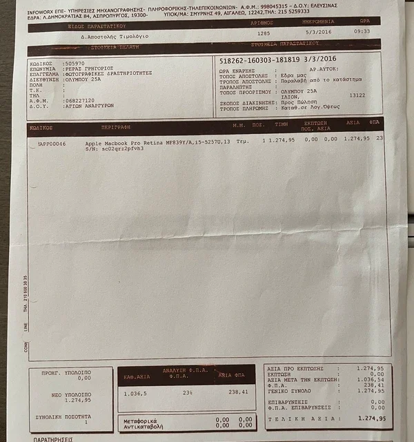 MaBook Pro 13” (Early 2015, A1502), i5, 16GB RAM, 128GB SSD ενσωματωμένος +128GB SD Kingston. Το laptop έχει γυρίσει στις εργοστασιακές ρυθμίσεις. Απολύτως λειτουργικό, στο κουτί του, με τον φορτιστή του και ακόμη έναν, απόδειξη αγοράς το 2016, απόδειξη τεχνικού ελέγχου επίσημης αντιπροσωπείας 15/12/2023. Δίνεται με ενσωματωμένο extra storage 128GB της Kingston στην ειδική υποδοχή. Εχει σε ένα σημείο ένα μικρό χτύπημα, χωρίς να επηρεάζει τη λειτουργία.